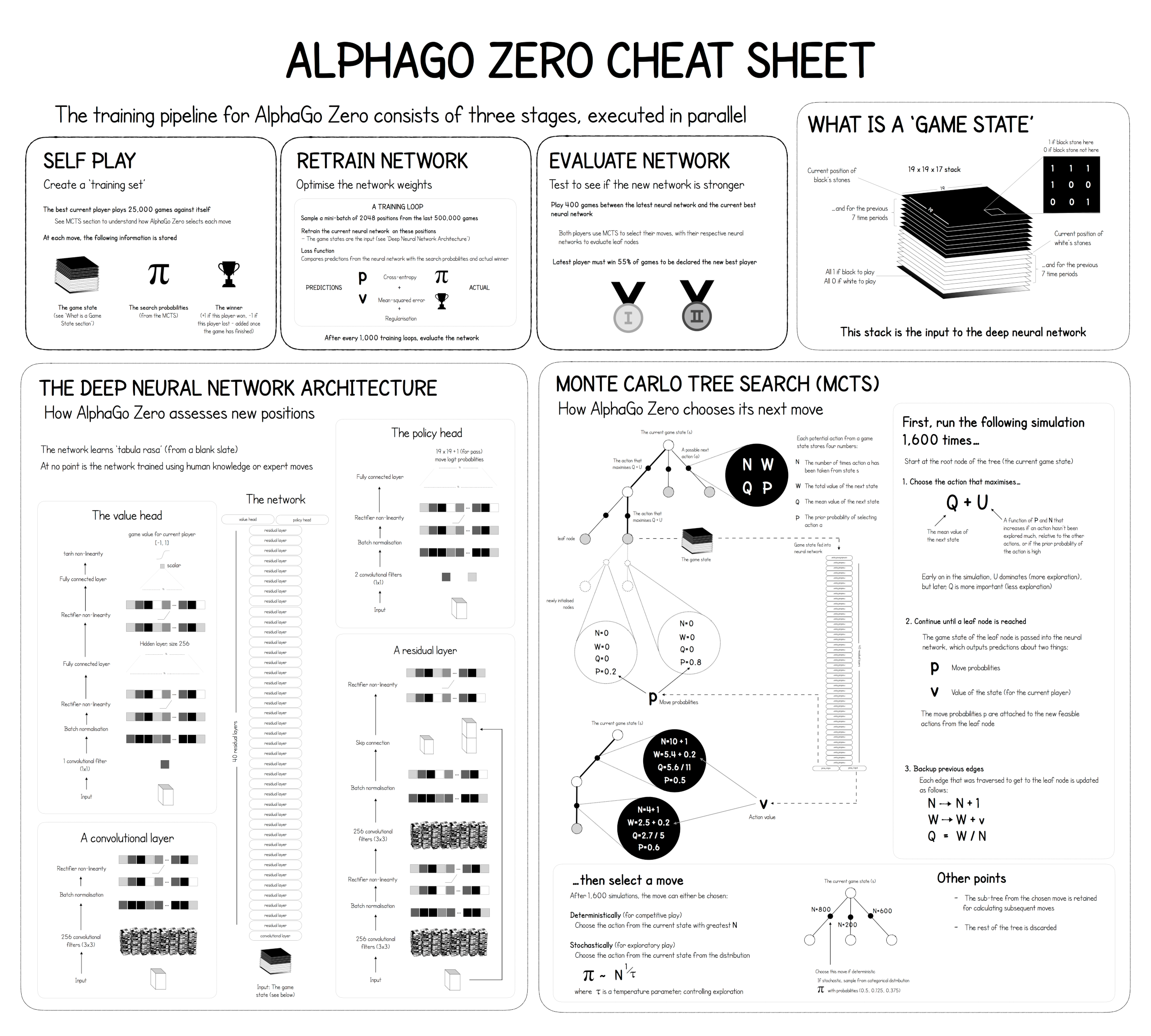 Courtesy of: AlphaGo Zero Explained In One Diagram. The paper on which the cheat sheet is based was published in Nature and is available here.